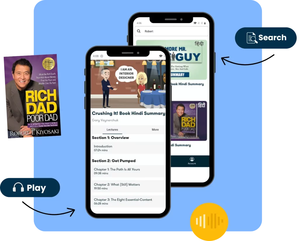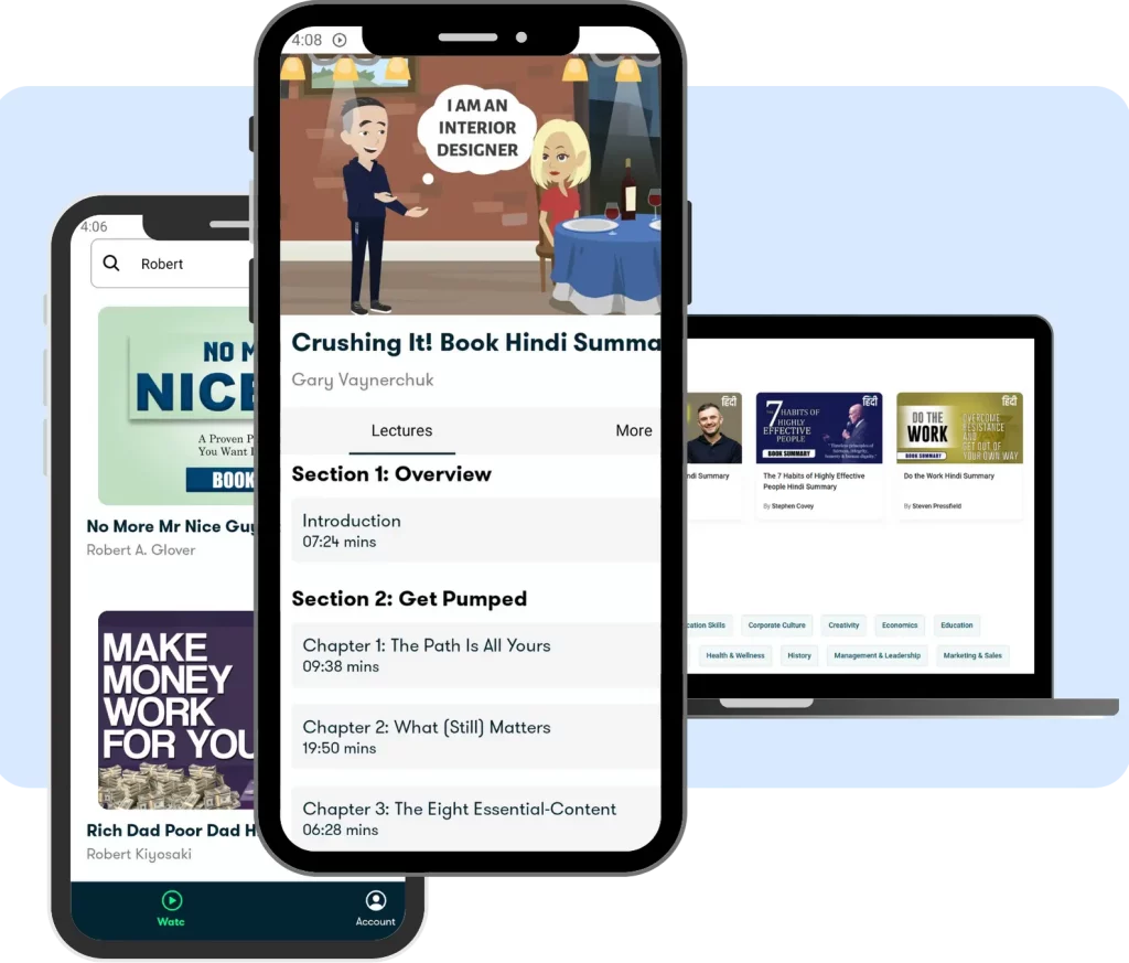 Premium प्लान में आपको हमारी पूरी समरीज़ लाइब्रेरी का अनलिमिटेड एक्सेस मिलता है। आप जब चाहें समरीज़ को देख या सुन सकते हैं, पसंदीदा कंटेंट सेव कर सकते हैं, और अपनी रुचि के अनुसार पर्सनल रिकमेंडेशन भी पाएंगे। इसके अलावा, आप एक ही अकाउंट को 4 डिवाइसेज़ पर एक साथ इस्तेमाल कर सकते हैं।